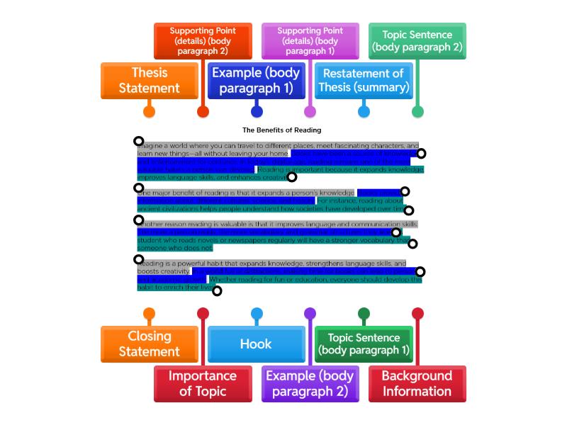 Hook, Background Information, Thesis Statement, Topic Sentence (body paragraph 1), Supporting Point (details) (body paragraph 1), Example (body paragraph 1), Topic Sentence (body paragraph 2), Supporting Point (details) (body paragraph 2), Example (body paragraph 2), Restatement of Thesis (summary), Importance of Topic, Closing Statement.