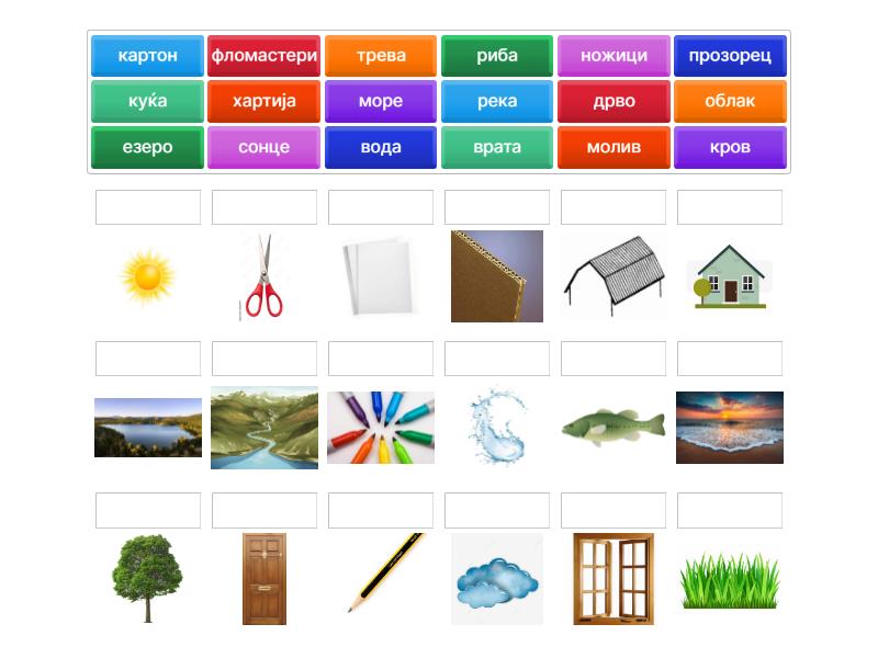 кров, прозорец, врата, дрво, облак, сонце, трева, картон, ножици, фломастери, хартија, молив, риба, вода, река, езеро, море, куќа,