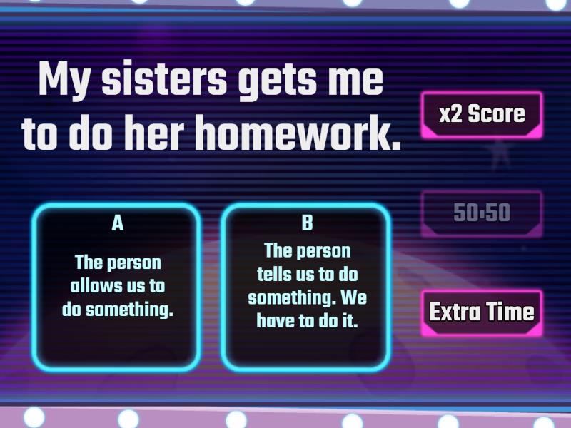 1) My sisters gets me to do her homework. a) The person allows us to do something. b) The person tells us to do something. We have to do it. 2) My mother lets me play video games all night. a) The person allows us to do something. b) The person tells us to do something. We have to do it. 3) My music teacher always gets me to sing songs in front of class. a) My music teacher always gets me to sing songs in front of class.The person allows us to do something. b) The person tells us to do something. We have to do it. 4) My teacher makes me help other students. a) The person allows us to do something. b) The person tells us to do something. We have to do it. 5) My teacher let’s me use my phone in class. a) The person allows us to do something. b) The person tells us to do something. We have to do it. 6) My music teacher always gets me to sing songs in front of class. a) The person allows us to do something. b) The person tells us to do something. We have to do it. 7) My friend has me help her do her homework. a) The person allows us to do something. b) The person tells us to do something. We have to do it. 8) My father makes me watch TV with him in the evenings. a) The person allows us to do something. b) The person tells us to do something. We have to do it. 9) My mother has me help her cook dinner. a) The person allows us to do something. b) The person tells us to do something. We have to do it. 10) My cat sometimes lets me pet her.  a) The cat allows us to do something. b) The cat tells us to do something. We have to do it.