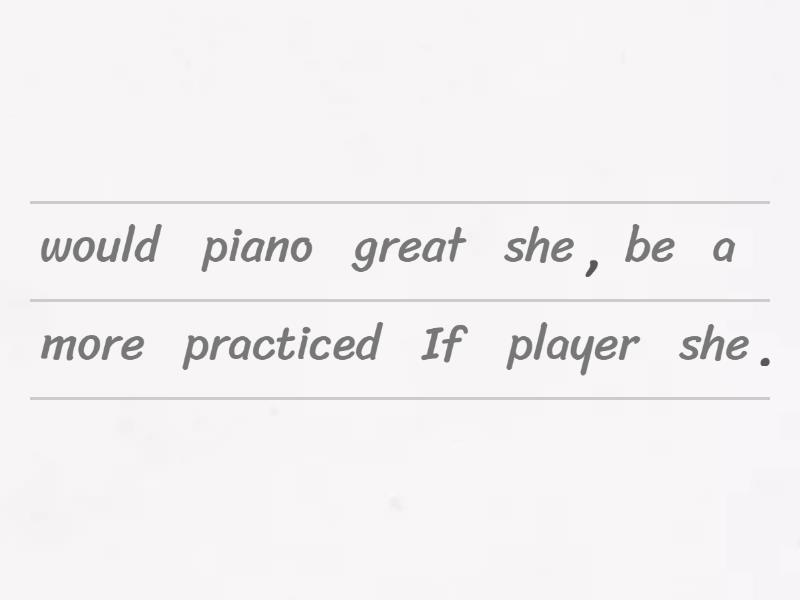 If she practiced more, she would be a great piano player., If we moved to another country, we would have a better life., If you took the train, you would get here more quickly., If he didn't go to bed so late, he would have more energy., If the TV programme had another presenter, it would be more popular., If I missed my flight, I would be very sad.,