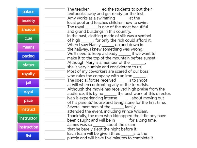 royal - Several members of the ______ family attended the event, including Prince William., royalty - Although Mary is a member of the _______, she is very humble and considerate to us., status - In the past, clothing made of silk was a symbol of high ______, for only the rich could afford it., palace - The royal ______ is one of the most beautiful and grand buildings in this country., jail - Thankfully, the men who kidnapped the little boy have been caught and will be in ______ for a long time., pacing - When I saw Nancy ______ up and down in the hallway, I knew something was wrong., pace - We’ll need to keep a steady ______ if we want to make it to the top of the mountain before sunset., clue - Each team will be given three ______s to the puzzle and will have five minutes to complete it., anxiety - Ivan is experiencing intense ______ about moving out of his parents’ house and living alone for the first time., anxious - James was so ______ about the exam that he barely slept the night before it., instruct - The teacher ______ed the students to put their textbooks away and get ready for the test., instruction - The special forces received ______s to shoot at will when confronting any of the terrorists., instructor - Amy works as a swimming ______ at the local pool and teaches children how to swim., fist - Most of my coworkers are scared of our boss, who rules the company with an iron ______.., means - Although the movie has received high praise from the audience, it is by no ______ the best work of this director.,