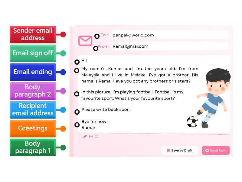 Recipient email address, Sender email address, Greetings, Body paragraph 1, Body paragraph 2, Email ending, Email sign off.