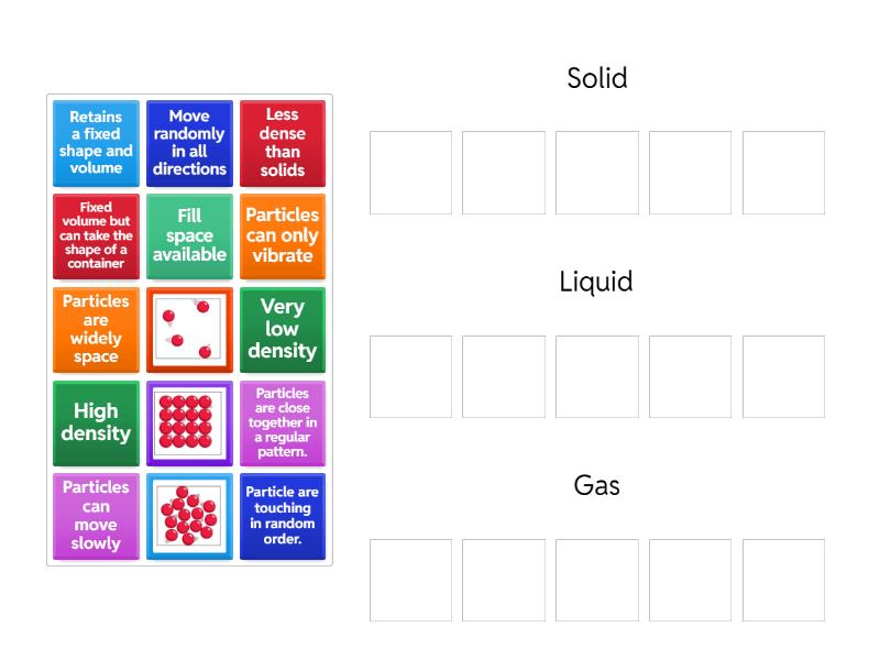 Solid: Particles are close together in a regular pattern., Particles can only vibrate, Retains a fixed shape and volume, , High density, Liquid: Particle are touching in random order., Fixed volume but can take the shape of a container, Particles can move slowly, , Less dense than solids, Gas: Particles are widely space, Move randomly in all directions, Fill space available , Very low density, ,