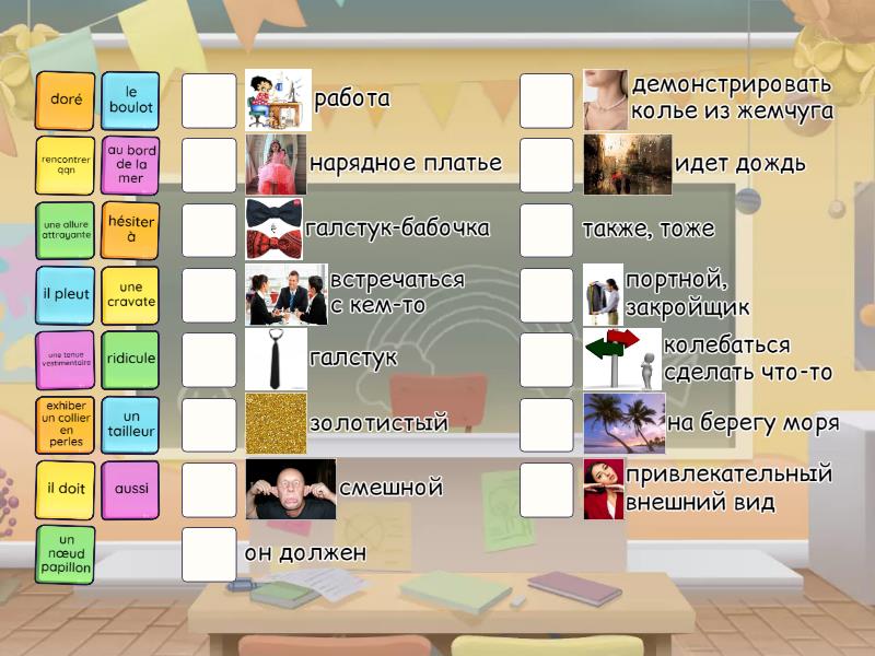 doré - золотистый, il doit - он должен, rencontrer qqn - встречаться с кем-то, hésiter à  - колебаться сделать что-то, une tenue vestimentaire - нарядное платье, une cravate - галстук, un nœud papillon - галстук-бабочка, ridicule - смешной, il pleut - идет дождь, aussi - также, тоже, un tailleur - портной, закройщик, le boulot - работа, exhiber un collier en perles - демонстрировать колье из жемчуга, une allure attrayante - привлекательный внешний вид, au bord de la mer - на берегу моря,