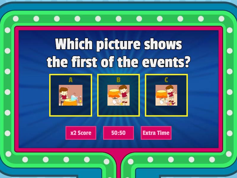 1) Which picture shows the first of the events? a) b) c) 2) Which picture shows the last of the events? a) b) c) 3) Which picture shows the last of the events? a) b) J c) 4) Which picture shows the last of the events? a) b) c) 5) Which picture shows what happens first? a) b) c)