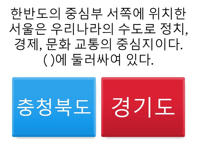 1) 한반도의 중심부 서쪽에 위치한 서울은 우리나라의 수도로 정치, 경제, 문화 교통의 중심지이다. ( )에 둘러싸여 있다. a) 충청북도 b) 경기도 2) 경기도는 한반도의 중서부에 위치하며, 동쪽은 ( ), 서쪽은 인천광역시와 황해, 남쪽은 충청도(충청남도, 충청북도)와 접하고 있다. a) 강원특별자치도 b) 경상북도 3) 인천광역시는 한반도 중서부에 자리잡고 서쪽으로 ( )에 접해 있다. 인천항과 인천 국제공항이 위치하고, 서울로 들어오는 서쪽 길목에 위치한 도시이다. a) 황해(서해) b) 동해 4) 강원특별자치도는 중부 지방의 동쪽에 위치하고 동쪽으로 동해를 길게 접하고 있다. 남북방향으로 ( )산맥이 있다. a) 소백 b) 태백 5) 충청북도는 강원특별자치도, 경기도, 충청남도, 세종특별자치시, ( ), 전북특별자치도, 경상북도에 둘러싸여 있어 바다와 접한 곳이 없다. a) 부산광역시 b) 대전광역시 6) 충청남도는 한반도 중남부에 위치하며, 충청북도의 ( )에 있으며, 북쪽으로 경기도, 남쪽으로 전북특별자치도와 접하고 있다. a) 서쪽 b) 동쪽 7) 대전광역시는 국토의 중앙에 위치한 교통의 중심지이다. ( ), 충청북도, ( )에 둘러싸여 있다. a) 충청남도, 세종특별자치시 b) 강원특별자치도, 인천광역시 8) 행정도시인 세종특별자치시는 ( ), 충청남도, ( )에 둘러싸여 있다. a) 대전광역시, 충청북도 b) 대구광역시, 경상북도 9) 전북특별자치도는 북쪽으로 충청 지방, 남쪽으로 전라남도가 위치하고 있다. 서쪽으로 황해, 동쪽으로 ( )와 맞닿아 있다. a) 경상도 b) 경기도 10) 전라남도는 전북특별자치도 남쪽에 위치하며, 서쪽과 남쪽은 바다(서해, 남해)와 맞닿아 있고, 동쪽은 ( )와 접해 있다. a) 경상북도 b) 경상남도 11) 광주광역시는 한반도의 서남부에 위치하며, ( )에 둘러싸여 있다. a) 제주특별자치도 b) 전라남도 12) 제주특별자치도는 우리나라 가장 ( )에 있는 행정구역으로 중심부에 한라산이 있다. a) 북쪽 b) 남쪽 13) 대구광역시는 산으로 둘러싸인 평탄한 땅에 있는 도시이다. ( )에 둘러싸여 있다. a) 경상도 b) 전라도 14) 우리나라 대표적인 공업도시인 울산광역시는 동쪽으로 ( ), 서쪽으로 경상남도, 남쪽으로 ( ), 북쪽으로 경상북도에 접해 있다. a) 동해, 부산광역시 b) 남해, 대전광역시 15) 우리나라 최대의 항구도시인 부산광역시는 동해와 ( )에 접해 있다. a) 남해 b) 황해 16) 경상북도는 한반도 동남부에 위치하며, 동쪽은 동해, 서쪽은 충청북도, 전북특별자치도, 북쪽은 강원특별자치도, 남쪽은 경상남도에 접하고 있다. 남한의 도 가운데 가장 면적이 넓고 동해에 ( )와 독도가 있는 도이다. a) 울릉도 b) 마라도 17) 경상남도는 부산광역시, ( ), 대구광역시, 경상북도, 전라남도, 전북특별자치도, 남해와 접해 있으며, 남쪽에 많은 섬이 있다. a) 대전광역시 b) 울산광역시