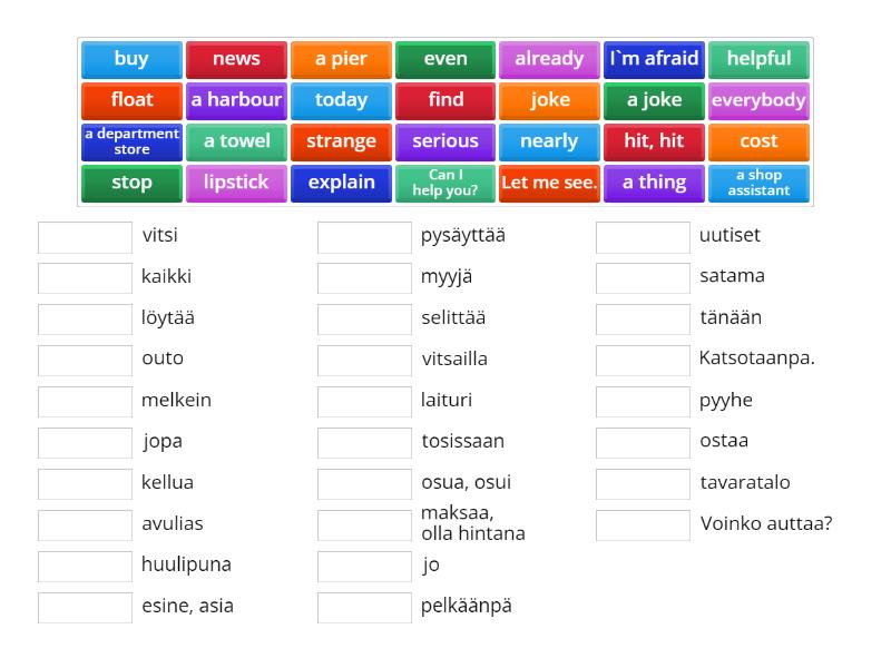 news - uutiset, today - tänään, strange - outo, a thing - esine, asia, float - kellua, a harbour - satama, nearly - melkein, stop - pysäyttää, hit, hit - osua, osui, a pier - laituri, a department store - tavaratalo, already - jo, find - löytää, everybody - kaikki, a towel - pyyhe, Can I help you? - Voinko auttaa?, Let me see. - Katsotaanpa., I`m afraid - pelkäänpä, joke - vitsailla, a joke - vitsi, explain - selittää, even - jopa, lipstick - huulipuna, serious - tosissaan, a shop assistant - myyjä, helpful - avulias, buy - ostaa, cost - maksaa, olla hintana,