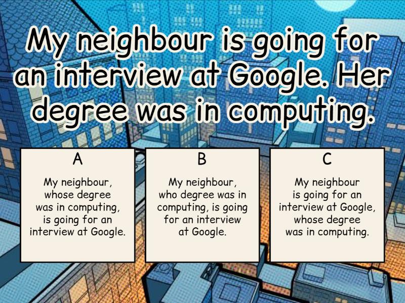 1) She was exhausted after the interview. It lasted two hours. a) She was exhausted after the interview, which lasted two hours. b) She, which lasted two hours, was exhausted after the interview. c) She was exhausted after the interview which lasted two hours. 2) My local department store has offered me a job. Two of my friends work there. a) My local department store, where two of my friends work, has offered me a job. b) My local department store, where two of my friends work there, has offered me a job. c) My local department store has offered me a job, where two of my friends work. 3) My neighbour is going for an interview at Google. Her degree was in computing. a) My neighbour, whose degree was in computing, is going for an interview at Google. b) My neighbour, who degree was in computing, is going for an interview at Google. c) My neighbour is going for an interview at Google, whose degree was in computing. 4) Completing the course means she can teach English abroad. It lasted six months. a) Completing the course, which lasted six months, means she can teach English abroad. b) Completing the course means she can teach English abroad, which lasted six months, c) Completing the course, that lasted six months, means she can teach English abroad. 5) I'll never forget my first job. It was in a toy factory. a) I'll never forget my first job, which was in a toy factory. b) I'll never forget my first job, where was in a toy factory. c) I'll never forget my first job which was in a toy factory. 6) My violin teacher helped me get a place at music college. He wanted me to be a professional. a) My violin teacher, who wanted me to be a professional, helped me get a place at music college. b) My violin teacher helped me get a place at music college, who wanted me to be a professional. c) My violin teacher, that wanted me to be a professional, helped me get a place at music college. 7) I studied at the London School of Economics. My father had been a student there. a) I studied at the London School of Economics, where my father had been a student. b) I studied at the London School of Economics, where my father had been a student there. c) I studied at the London School of Economics where my father had been a student. 8) Jemma wants to study languages at university. Her dad is French. a) Jemma, whose dad is French, wants to study languages at university. b) Jemma whose dad is French wants to study languages at university. c) Jemma, which dad is French, wants to study languages at university. 9) My neighbour is learning the guitar. He used to be a singer. a) My neighbour, who used to be a singer, is learning the guitar. b) My neighbour, whose used to be a singer, is learning the guitar. c) My neighbour is learning the guitar, who used to be a singer. 10) The Grand Hotel has closed. We spent three weeks one summer there. a) The Grand Hotel, where we spent three weeks one summer, has closed. b) The Grand Hotel has closed, where we spent three weeks one summer.