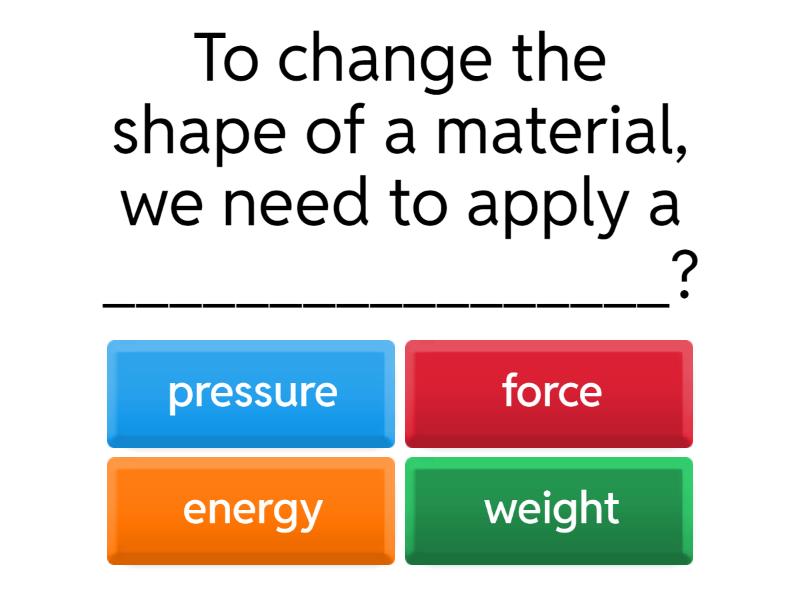 1) To change the shape of a material, we need to apply a _________________? a) pressure b) force c) energy d) weight 2) What temperature does water boil? a) 50 degrees b) 700 degrees c) 0 degrees d) 100 degrees 3) What temperature does water freeze? a) 0 degrees b) 100 degrees c) - 5 degrees d) 50 degrees 4) Which state - spreads to fill the bottom of a container, can flow, cannot be compressed easily and particles slide over each other? a) Solid b) Liquid c) Gas 5) Which state of matter is show in this diagram? a) Solid b) Liquid c) Gas 6) Which of these materials are a solid? a) Shaving foam, chocolate and water b) Washing up liquid, wood and oxygen c) Water vapour, perfume and copper d) Sand, plastic and sugar 7) What is the process when we add heat to chocolate and it changes state? a) Evaporation b) Condensation c) Melting d) Freezing 8) What process would need to take place to turn water into ice? a) Melt b) Condense c) Evaporate d) Freeze 9) What process is happening in C a) evaporation b) collection c) condensation d) precipitation 10) What process has taken place in this image? a) Condensation b) Melting c) Evaporation d) Freezing 11) What process has taken place in this image? a) Melting b) Evaporation c) Freezing d) Condensation 12) What are the best conditions to dry washing? a) Cool and windy b) Dry and still c) Sunny and breezy d) Sunny and still