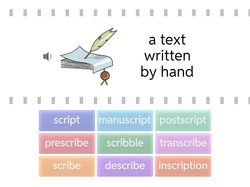 manuscript - a text written by hand, prescribe - to write or order beforehand, scribe - a person who copies out documents,, scribble - to write carelessly or hastily, transcribe - to write a copy of something or transfer voice to text, script - the written text of a play to movie, postscript - a note written after the main body of a letter, inscription - words written or engraved on a surface, describe - to write or tell about in detail,