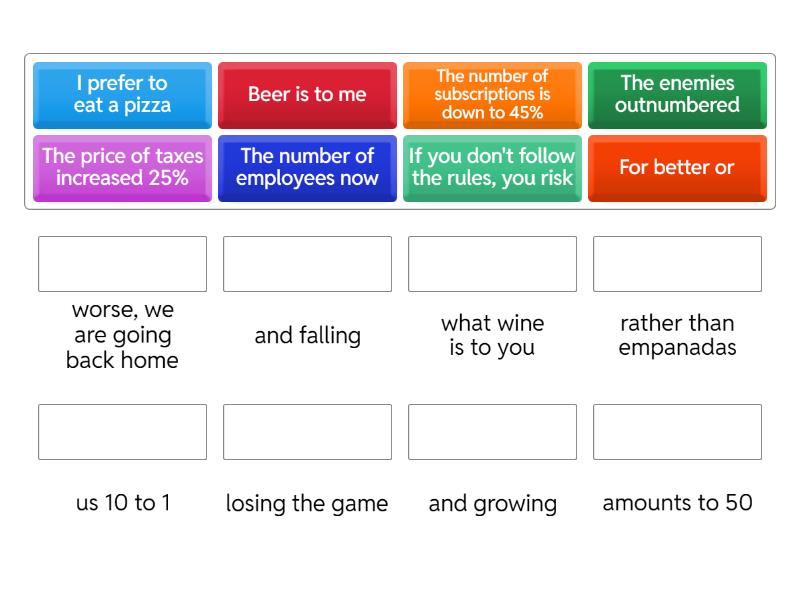 Beer is to me - what wine is to you, For better or - worse, we are going back home, If you don't follow the rules, you risk - losing the game, The enemies outnumbered - us 10 to 1, I prefer to eat a pizza - rather than empanadas, The number of employees now - amounts to 50, The number of subscriptions is down to 45% - and falling, The price of taxes increased 25% - and growing ,
