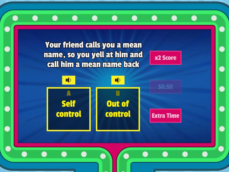 1) Your friend calls you a mean name, so you yell at him and call him a mean name back a) Self control b) Out of control 2) Your teacher is reading a book you don't like so you start making noise and rolling around on the floor a) Self control b) Out of control 3) Your friend is running in the hallway so you run after them and tell them not to run a) Self Control b) Out of Control 4) You follow the directions the teacher gives you right away a) Self Control b) Out of Control 5) You are upset that you didn't get called on to answer a question so you take a deep breath a) Self Control b) Out of control 6) You made an unexpected choice and walk at recess, you calmly accept your consequence a) Self Control b) Out of Control 7) Your teacher gives you a math paper to do and you rip it up a) Self Control b) Out of Control 8) Your friend is bothering you while you are trying to work so you ignore them and keep reading a) Self Control b) Out of Control 9) You ask your mom for a new toy and she says no, so you throw yourself on the ground kicking and screaming a) Self Control b) Out of Control 10) You are upset at your teacher so you run out of the room a) Self Control b) Out of Control 11) You are sitting quietly listening to your teacher read a book a) Self Control b) Out of Control 12) You are taking turns playing a game with your friends a) Self Control b) Out of Control 13) You are playing around in the bathroom a) Self Control b) Out of Control 14) Your friend is telling a story and you wait your turn to speak a) Self Control b) Out of Control 15) You don't know how to do a math problem so you raise your hand and wait patiently for the teacher a) Self Control b) Out of Control 16) Your teacher is trying to give directions and you are plugging your ears a) Self Control b) Out of Control 17) You lose a game so you start pouting and calling your friends mean names a) Self Control b) Out of Control 18) You make a mistake on your work so you take a deep breath and try again a) Self Control b) Out of Control 19) You are upset in the classroom so you ask your teacher for a break a) Self Control b) Out of Control 20) Ms. Gould and Mrs. Kordosky are awesome and think you all are AWESOME too!!! a) True b) False