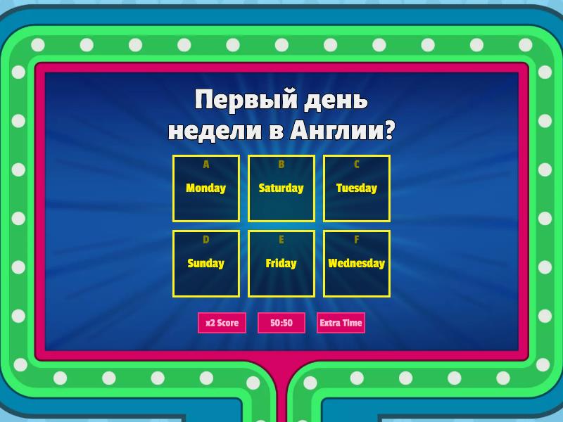 1) Первый день недели в Англии? a) Monday b) Saturday c) Tuesday d) Sunday e) Friday f) Wednesday 2) Нам давали на обед помидоры цвета... a) Orange b) Blue c) Red d) Pink e) Green f) Violet 3) Столица Великобритании? a) London b) Moscow c) Rome d) United Kindom e) Berlin f) Japan 4) Ты да я... a) They b) He c) It d) I e) We f) You 5) Какой из месяцев самый короткий? a) March b) October c) August d) July e) December f) February 6) Мама, папа, я - вместе дружная... a) Children b) Family c) Parents d) Father e) Uncle f) Grandmother 7) Я услышу «Мяу» сегодня и увижу... a) Shark b) Goose c) Lion d) Cat e) Bear f) Frog 8) Каждый день её вы пьёте, утоляет жажду… a) Coffee b) Tea c) Water d) Milk e) Juice f) Cola 9) Шесть в английском будет… a) Six b) Nine c) Five d) One e) Ten f) Eight 10) Кто учит детей в школе? a) Builder  b) Postman  c) Pilot d) Fireman  e) Doctor f) Teacher