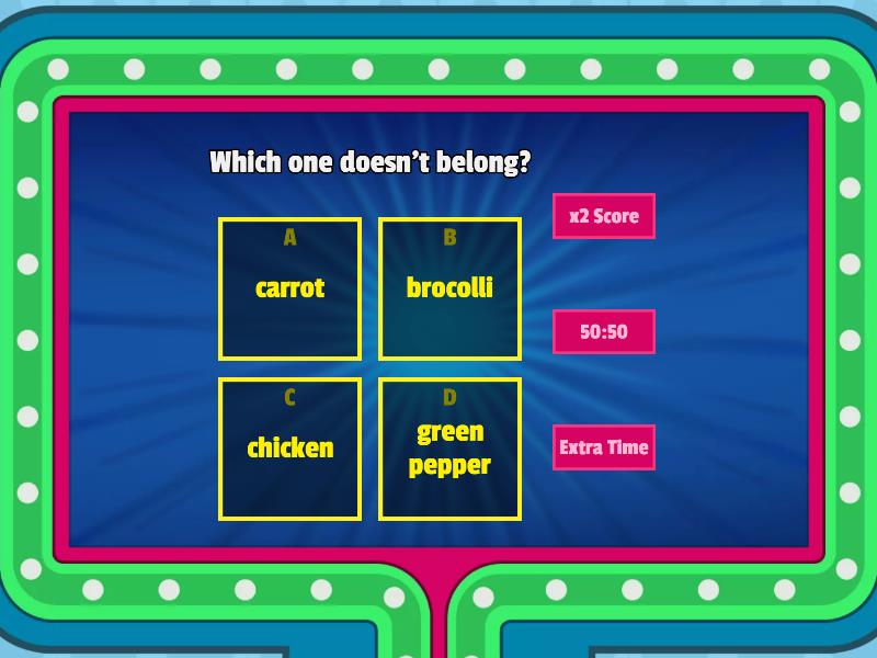 1) Which one doesn't belong? a) carrot b) brocolli c) chicken d) green pepper 2) Which one doesn't belong? a) stove b) fire c) ice cube d) sun 3) Which one doesn't belong? a) shoe b) slipper c) boot d) hat 4) Which one doesn't belong? a) igloo b) shed c) apartment d) cabin 5) Which one doesn't belong? a) ice b) lemonade c) water d) tea 6) Which one doesn't belong? a) arm b) hand c) leg d) slipper 7) Which one doesn't belong? a) shorts b) T-shirt c) mittens d) bathing suit 8) Which one doesn't belong? a) doctor b) teacher c) singer d) baby 9) Which one doesn't belong? a) A b) F c) T d) 9 10) Which one doesn't belong? a) robin b) parrot c) hawk d) airplane 11) Which one doesn't belong? a) pencil b) pen c) paper clip d) marker 12) Which one doesn't belong? a) Thursday b) Thanksgiving c) Christmas d) Easter 13) Which one doesn't belong? a) jar b) box c) can d) necklace 14) Which one doesn't belong? a) octopus b) shark c) whale d) Giraffe 15) Which one doesn't belong? a) thunder b) snow c) explosion d) train 16) Which one doesn't belong? a) hat b) cap c) sock d) helmet 17) Which one doesn't belong? a) tennis b) baseball c) music d) football 18) Which one doesn't belong? a) rainy b) grumpy c) windy d) sunny 19) Which one doesn't belong? a) ceiling b) floor c) rock d) wall 20) Which one doesn't belong? a) tree b) bird c) airplane d) kite