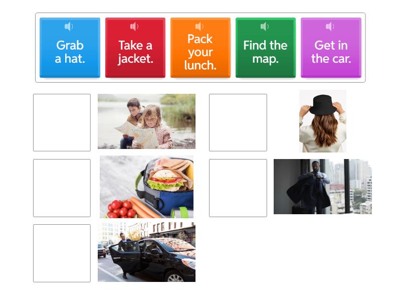 Pack your lunch., Grab a hat., Take a jacket., Get in the car., Find the map.,