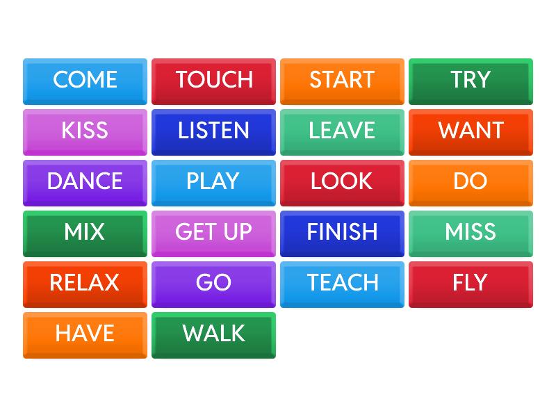 DANCE - DANCES, TRY - TRIES, LEAVE - LEAVES, WALK - WALKS, TOUCH - TOUCHES, FINISH - FINISHES, MISS - MISSES, GO - GOES, LOOK - LOOKS, MIX - MIXES, START - STARTS, COME - COMES, GET UP - GETS UP, HAVE - HAS, PLAY - PLAYS, DO - DOES, KISS - KISSES, TEACH - TEACHES, FLY - FLIES, LISTEN - LISTENS, RELAX - RELAXES, WANT - WANTS,