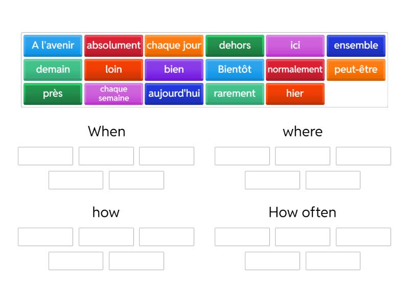 When : Bientôt, hier, aujourd'hui, demain, A l’avenir, where : près, ici, dehors, loin, how: chaque semaine, rarement, normalement, chaque jour, How often : absolument, bien, ensemble, peut-être,