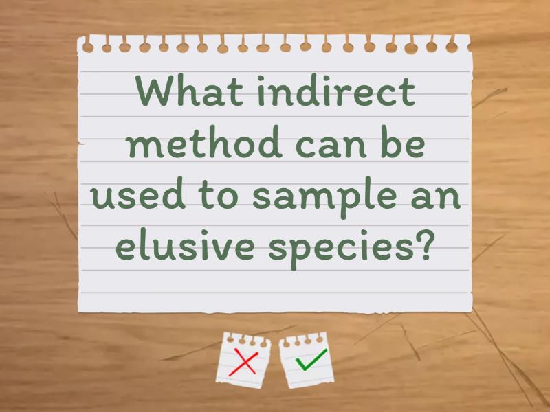 What is a point count? - When an observer stands in a fixed location and records all birds seen in that time. This could be compared to another area or time of day., What might be suitable sampling techniques for sessile or slow moving organisms? - Quadrats or transects (quadrats can be used on land, water and trees), Give 2 examples of techniques used for sampling mobile species? - Traps and nets, What direct method can be used to sample an elusive species? - Camera traps, What indirect method can be used to sample an elusive species? - Scat sampling, Can you give some examples of hazards in fieldwork? - Difficult terrain, adverse weather, isolation, diseased organisms, Define 'risk' - The likelihood of harm from exposure to a hazard, What might some control measures be when sampling in the wild? - Appropriate equipment, clothing, footwear and a way to communicate, What considerations must be made when sampling? - Rare and vulnerable species plus habitats protected by legislation, What is an elusive species? - A species that is difficult to find or spot,