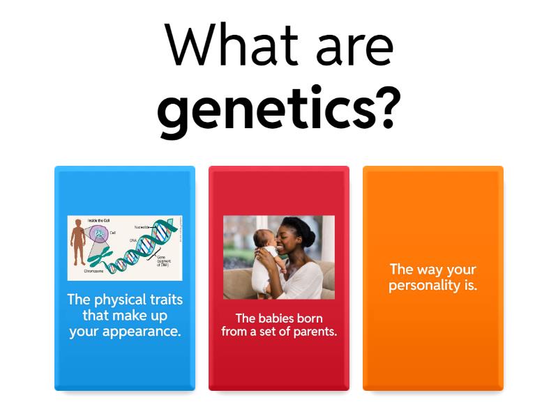 1) What are genetics? a) The physical traits that make up your appearance. b) The babies born from a set of parents. c) The way your personality is. 2) Which of the following is NOT an example of a trait? a) hair color b) eye color c) favorite sport d) height 3) What is an offspring? a) A spring that doesn't work right. b) The baby that is born from animals reproducing. c) The parents of a baby. 4) Why are adaptations important? a) They are what make an animal feel special. b) They help animals to survive their environments. c) They give animals super powers. 5) Thomas said that he inherited his awesome style from his parents. Would Thomas be correct? a) No, you can't inherit style only traits. b) Yes, you can have your parents taste in clothes passed down to you. 6) A litter of kittens are born. 4 of them are brown and 1 of them is white. Which trait is dominant? a) brown fur b) white fur 7) Sam's parents both have curly hair, her grandparents have curly hair, and she has curly hair. She doesn't understand why her sister has straight hair. a) It is because her sister isn't related to her. b) It is because straight hair is a recessive trait. c) It is because straight hair is a dominant trait. 8) Why might siblings that come from the same parents and live in the same family have different traits? a) Because they like different things. b) Because siblings can have variations. c) That isn't possible because siblings always look the same.