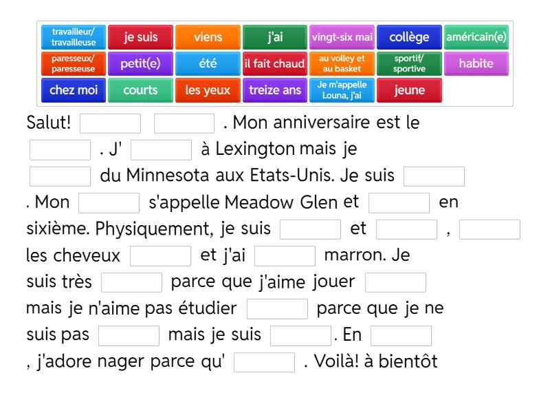 Salut! ____ ____ . Mon anniversaire est le ____ . J' ____ à Lexington mais je ____ du Minnesota aux Etats-Unis. Je suis ____ . Mon ____ s'appelle Meadow Glen et ____ en sixième. Physiquement, je suis ____ et ____ , ____ les cheveux ____ et j'ai ____ marron. Je suis très ____ parce que j'aime jouer ____ mais je n'aime pas étudier ____ parce que je ne suis pas ____ mais je suis ____. En ____ , j'adore nager parce qu' ____ . Voilà! à bientôt