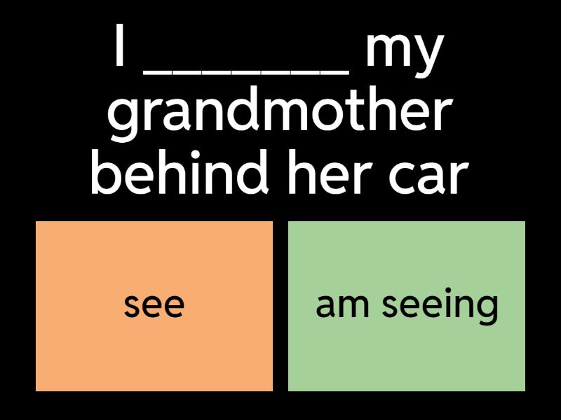 1) I _______ my grandmother behind her car a) see b) am seeing 2) He ____ so interesting! a) is b) is being 3) I ______ an old car a) am having b) have 4) I ___________ a quick break a) have b) am having 5) Do you _____ any problems with that? a) seeing b) see 6) I __________ your pasta to see if I like it a) taste b) am tasting 7) Wait a moment! I __________ about it a) am thinking b) think 8) The soda ________ like water  a) tastes b) is tasting 9) He _______ she’s beautiful a) thinks b) is thinking 10) He __________ very unhelpful today a) is b) is being