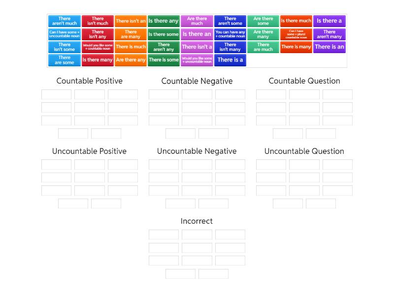 Countable Positive: There is a, There are some, There is an, There are many, You can have any + countable noun, Countable Negative: There isn't a, There isn't an, There aren't any, There aren't many, Countable Question: Is there a, Is there an, Are there any, Can I have some + plural countable noun, Would you like some + countable noun, Are there many, Uncountable Positive: There is some, Uncountable Negative: There isn't much, There isn't any, Uncountable Question: Is there any, Can I have some + uncountable noun, Would you like some + uncountable noun, Is there much, Incorrect: Are there some, Is there some, There aren't some, There isn't some, There is much, There is many, There are much, There aren't much, There isn't many, Are there much, Is there many,