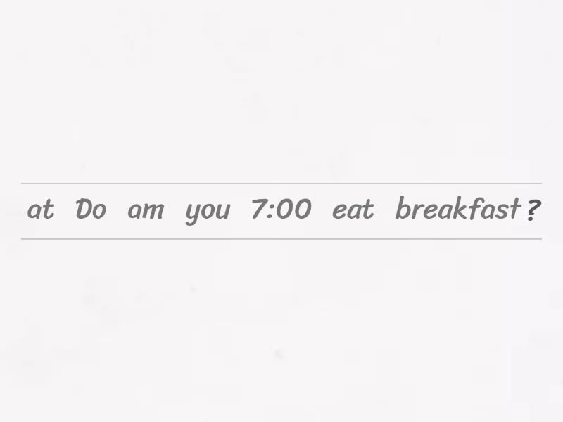 Do you eat breakfast at 7:00 am?, Does he go to work at 8:00 am?, Do they take a shower in the morning?, Does she eat lunch at noon?, Do we watch TV in the evening?, Do you brush your teeth at 10:00 pm?, Does he get up at 6:30 am?, Do they eat dinner at 7:00 pm?, Do we hang out with friends on Saturdays?, Do you cook dinner at 8:00 pm?,