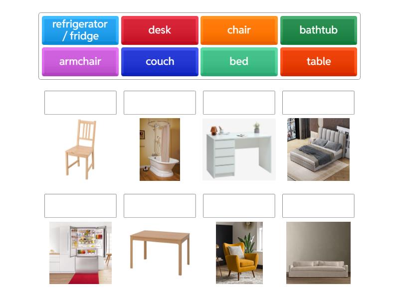 armchair, refrigerator / fridge, bathtub, table, chair, couch, desk, bed,