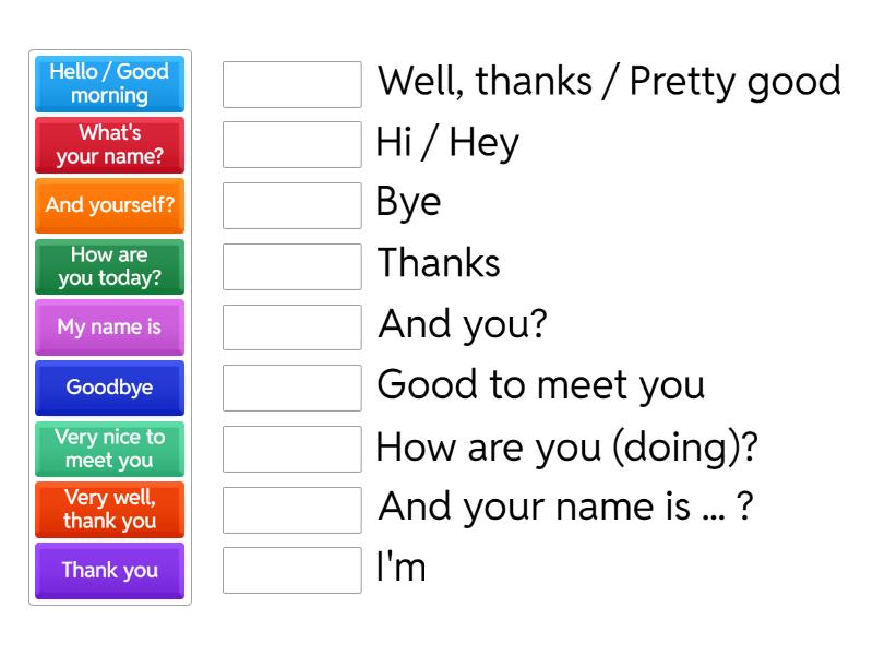 Hello / Good morning - Hi / Hey, What's your name? - And your name is ... ? , My name is - I'm, Very nice to meet you - Good to meet you, How are you today? - How are you (doing)?, Very well, thank you - Well, thanks / Pretty good, And yourself? - And you?, Thank you - Thanks, Goodbye - Bye,