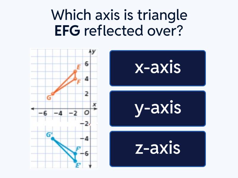 1) Which axis is triangle EFG reflected over? a) x-axis b) y-axis c) z-axis 2) Which equation represents the line of reflection shown on the graph? a) y = 1 b) y = -2 c) x = 0 d) x = 1 3) TRUE or FALSE:  Triangle A'B'C'  is a reflection of triangle ABC. a) true b) false 4) What type of transformation is shown on the graph? a) dilation b) reflection c) rotation d) translation 5) What type of transformation is shown on the graph? a) dilation (reduction) b) dilation (enlargement) c) rotation, 180º d) reflection over y-axis 6) How many degrees was triangle ABC rotated? a) 90º clockwise b) 90º counterclockwise c) 180º d) 270º clockwise 7) The m∠C is 72º. What is the m∠C' ? a) 72º b) 75º c) 90º d) 144º