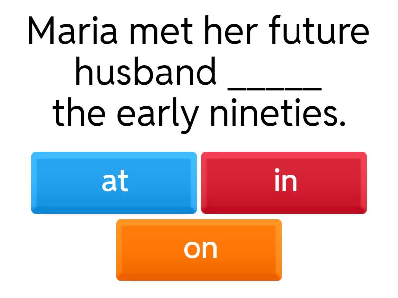 1) Maria met her future husband _____ the early nineties. a) at b) in c) on 2) Not everyone is willing to work overtime _____ weekends. a) at b) in c) on 3) The teacher is here _____ Mondays and Firdays. a) at b) in c) on 4) A positive attitude will bring great results _____ the end. a) at b) in c) on 5) I performed badly because I wasn't sleeping well _____ night. a) at b) in c) on 6) It's always difficult to know what to do _____ your first evening in a new city. a) at b) in c) on 7) Most of my friends look forward to watching football _____ Saturday afternoons. a) at b) in c) on 8) _____ the beginning of the week I was not absolutely sure I would enjoy my new job. a) at b) in c) on 9) My company is overloaded with printing work _____ certain times of day. a) at b) in c) on 10) A good knowledge of several languages will help us _____ the future. a) at b) in c) on
