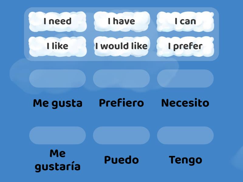 I prefer - Prefiero, I like - Me gusta, I would like - Me gustaría, I have - Tengo, I need - Necesito, I can - Puedo,