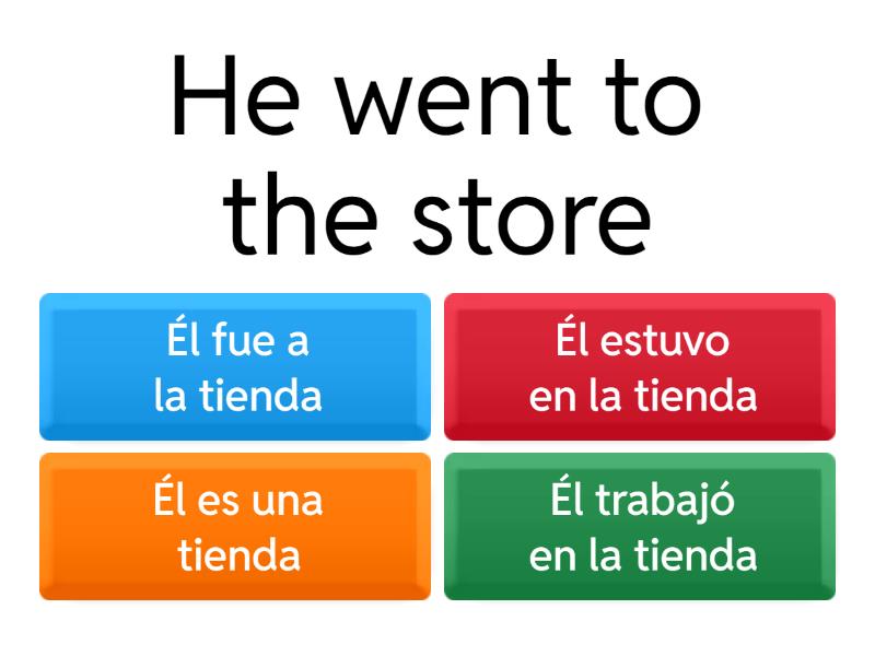 1) He went to the store a) Él fue a la tienda b) Él estuvo en la tienda c) Él es una tienda d) Él trabajó en la tienda 2) She was in Madrid yesterday a) Ella llegóa Madrid ayer b) Ella estuvo en Madrid ayer c) Ella fue a Madrid ayer 3) Carlos received money last night a) Carlos tenía dinero anoche b) Carlos tuvo dinero anoche c) Carlos recibió dinero anoche 4) They put it on the table a) Ellos lo ponen en la mesa b) Ellos lo quitaron de la mesa c) Ellos lo pusieron en la mesa 5) They were in Colombia last year a) Ellos estuvieron en Colombia el año pasado b) Ellos fueron a Colombia el año pasado c) Ellos van a Colombia el año pasado 6) John told the truth a) Juan dice la verdad b) Juan digo la verdad c) Juan dijo la verdad 7) They did their homework a) Ellos hicieron su tarea b) Ellos hacieron su tarea c) Ellos hizo su tarea 8) She gave it to me a) Ella me lo dio b) Ella me lo di c) Ella me lo dimos 9) We saw the movie a) Vemos la película b) Vimos la película c) Vieron la película 10) They played baseball yesterday a) Ellos juegan al béisbol ayer b) Ellos juegaron al béisbol ayer c) Ellos jugaron al béisbol ayer 11) I knocked on the door a) Yo tocé la puerta b) Yo tocó la puerta c) Yo toqué la puerta 12) She took a shower last night a) Ella se duchó anoche b) Ella duchó anoche c) Ella me duché anoche 13) We walked to the park a) Caminamos al parque b) Fueron al parque c) Corrimos al parque 14) Paco y Juan read the book last night a) Paco y Juan leyeron el libro anoche b) Paco y Juan leieron el libro anoche c) Paco y Juan leen el libro anoche 15) He preferred to stay home a) Él preferió quedarse en casa b) Él prefirió quedarse en casa c) Él prefiere quedarse en casa 16) They slept well a) Ellos durmieron bien b) Ellos dormieron bien c) Ellos dormiste bien 17) I paid the bill a) Yo pago la cuenta b) Yo pagué la cuenta c) Yo pagé la cuenta