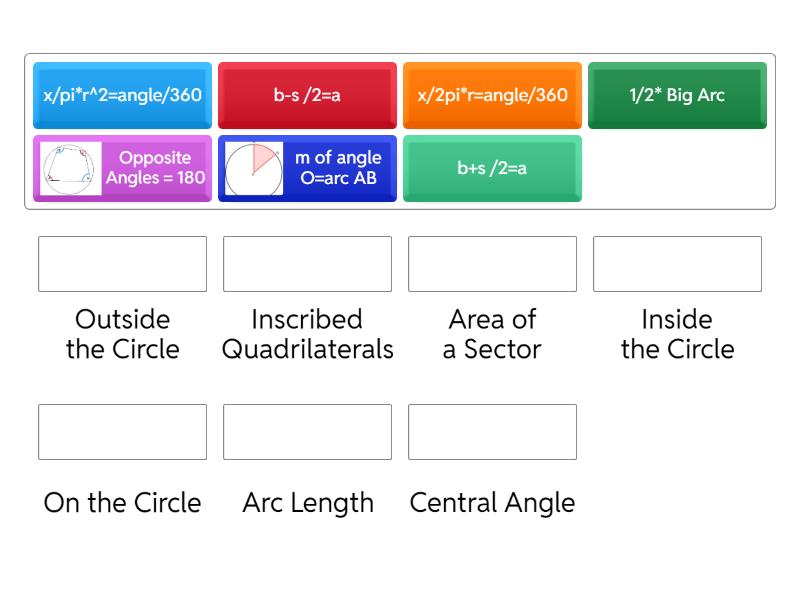 x/pi*r^2=angle/360 - Area of a Sector, x/2pi*r=angle/360 - Arc Length, b-s /2=a - Outside the Circle, 1/2* Big Arc - On the Circle, b+s /2=a - Inside the Circle, m of angle O=arc AB - Central Angle, Opposite Angles = 180 - Inscribed Quadrilaterals,