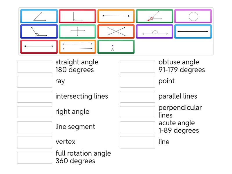 acute angle 1-89 degrees, full rotation angle 360 degrees, line, line segment, obtuse angle 91-179 degrees, parallel lines, perpendicular lines, intersecting lines, ray, point, right angle, straight angle 180 degrees, vertex,