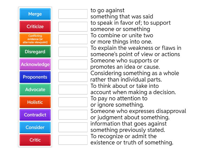 Proponents - Someone who supports or promotes an idea or cause., Critic - Someone who expresses disapproval or judgment about something., Criticize  - To explain the weakness or flaws in someone's point of view or actions, Merge - To combine or unite two or more things into one., Holistic - Considering something as a whole rather than individual parts., Consider - To think about or take into account when making a decision., Disregard - To pay no attention to or ignore something., Acknowledge - To recognize or admit the existence or truth of something., Conflicting evidence (or alternate viewpoint) - information that goes against something previously stated., Advocate - to speak in favor of; to support someone or something, Contradict - to go against something that was said,