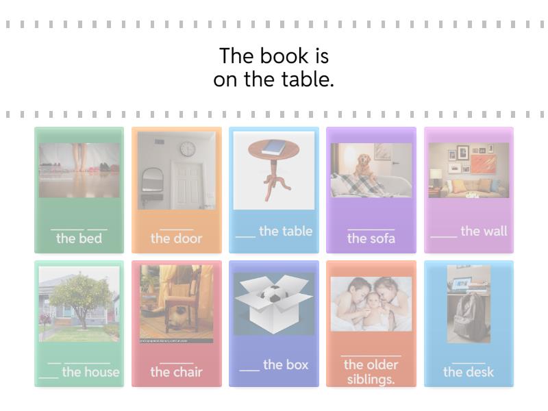 ___ the table - The book is on the table., _____ the chair - The cat is under the chair., _____ the door - The clock is above the door., _____ ___ the bed - The shoes are next to the bed., ____ the wall - The picture is on the wall., ___ the box - The ball is in the box., __ _______ ___ the house - The tree is in front of the house., _________ the older siblings. - The baby is between the older siblings., _______ the sofa - The dog is behind the sofa., _____ the desk - The bag is near the desk.,