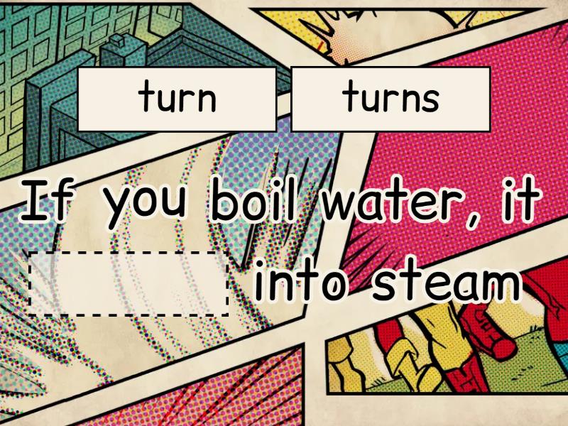 If you boil water, it ____ into steam If you ____ ice, it melts If you heat water to 100 degrees Celsius, it ____. If you do not keep the ice cream in the freezer, it ____. If you ____ water, it ____ into ice. If you ____ ice, it turns into water. If you don't ____, you are ____. If you ____, you pass the exam. If you ____ yellow and red, you get ____. If you don't sleep, you ____ get up early. If you touch ____, you ____ burned. If you ____ in the rain, you get ____.
