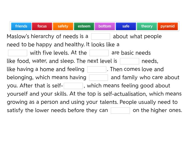 Maslow's hierarchy of needs is a ____ about what people need to be happy and healthy. It looks like a ____ with five levels. At the ____ are basic needs like food, water, and sleep. The next level is ____ needs, like having a home and feeling ____. Then comes love and belonging, which means having ____ and family who care about you. After that is self-____, which means feeling good about yourself and your skills. At the top is self-actualisation, which means growing as a person and using your talents. People usually need to satisfy the lower needs before they can ____ on the higher ones.