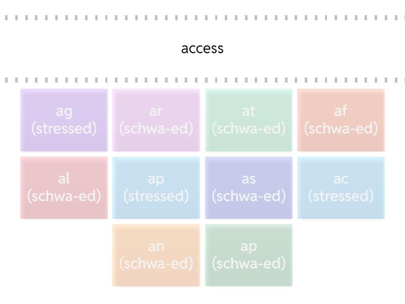 ac (stressed) -  access, al (schwa-ed) -  allow, an (schwa-ed) - annihilate, ap (schwa-ed) - applause, ar (schwa-ed) - arrange, as (schwa-ed) - assure, at (schwa-ed) - attain, af (schwa-ed) - affect, ag (stressed) - aggression, ap (stressed) - application,