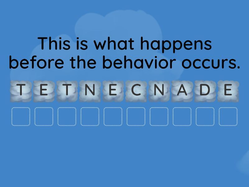 ANTECEDENT - This is what happens before the behavior occurs. , CONSEQUENCE - This refers to what happens immediately after the behavior. , BEHAVIOR - This is the observable action or response that occurs in a specific situation. It is what the person says or does. , NEGATIVE - Refers to the removal of stimuli to the environment., PUNISHMENT - Decreases the future frequency of behavior., POSITIVE - Defined as adding stimuli to the enviornment., REINFORCEMENT - Increases the future frequency of behavior.,