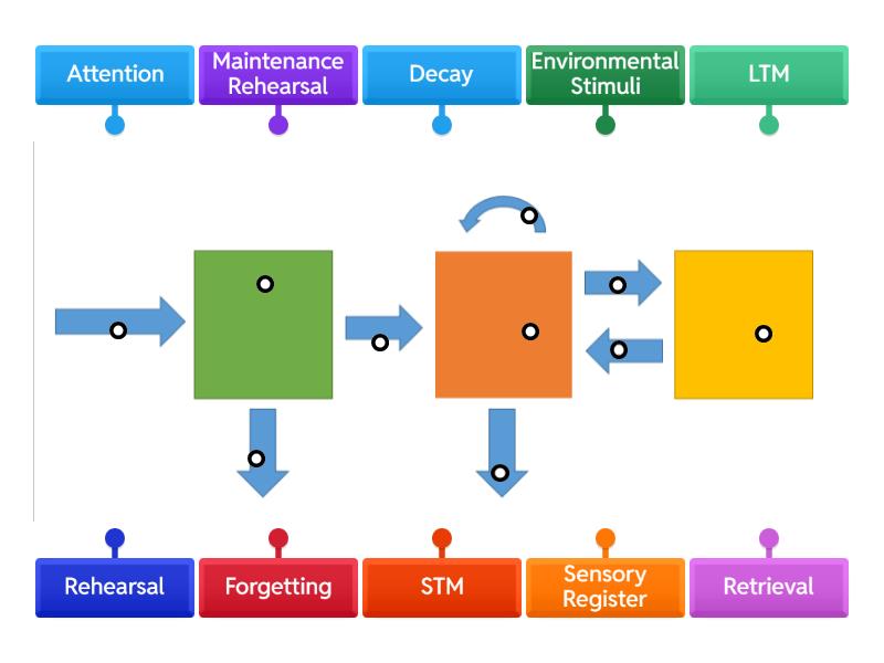 Decay, Forgetting, Sensory Register, Environmental Stimuli, Retrieval, Rehearsal, LTM, STM, Maintenance Rehearsal, Attention.