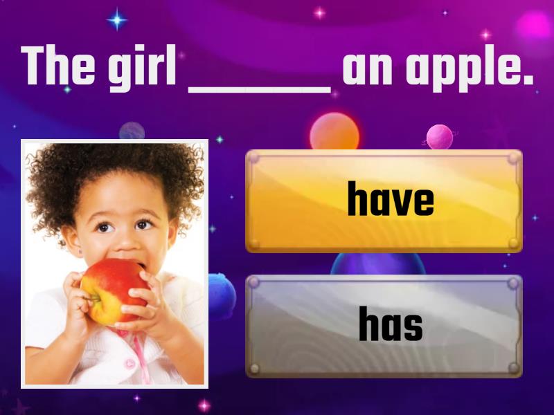 1) The girl _____ an apple. a) have b) has 2) They _____ a lot of homework. a) have b) has 3) She _____ a pet dog. a) have b) has 4) She _____ a lot of flowers. a) have b) has 5) The girl _____ an umbrella. a) have b) has 6) They _____ a lot of fun jumping in the leaves. a) have b) has 7) The girl ______ a hat on her head. a) have b) has 8) We __________ math homework a) has b) have 9) I _____ a cookie. a) have b) has 10) Do you _______________ a pencil? a) has b) have 11) Mary ______________ a brother a) has b) have 12) He ______________ a new book. a) has b) have 13) The cats ____  hats. a) has b) have 14) The boys _____ fun playing. a) have b) has 15) You ____ have a new pet. a) has b) have