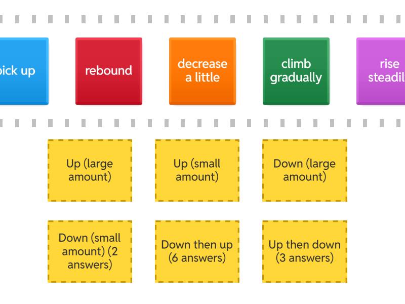 Up (large amount) : sharp increase, increase rapidly, shoot up, triple, rise rapidly, Up (small amount) : climb gradually, increase slowly, gradual increase, rise steadily, Down (large amount) : crash, fall sharply, halve, sharp decline, plummet, dive, Down (small amount) (2 answers): decrease a little, drop slightly, steady decline, Down then up (6 answers): bounce back, recover, dip, pick up, regain lost ground, rebound, Up then down (3 answers): pass its peak, slip back, peak then fall back,