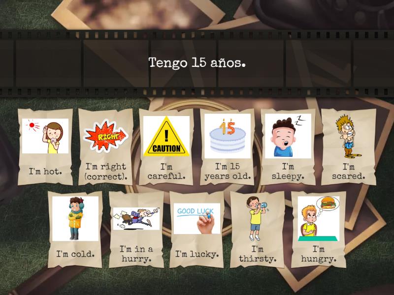 I'm 15 years old. - Tengo 15 años., I'm hot. - Tengo calor., I'm cold. - Tengo frío., I'm hungry. - Tengo hambre., I'm thirsty. - Tengo sed., I'm sleepy. - Tengo sueño., I'm careful. - Tengo cuidado., I'm scared. - Tengo miedo., I'm lucky. - Tengo suerte., I'm in a hurry. - Tengo prisa., I'm right (correct). - Tengo razón.,