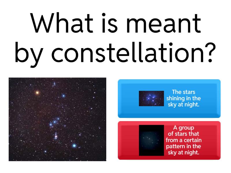 1) What is meant by constellation? a) The stars shining in the sky at night. b) A group of stars that from a certain pattern in the sky at night. 2) Which of the following objects can be related to the shape of the Big dipper constellation? a) b) 3) What is the importance of constellations to humans? a) To show directions b) To find the location of a certain place 4) When does the constellation occur? a) Daytime b) Night time 5) This picture shows a a) Constellation b) Solar system