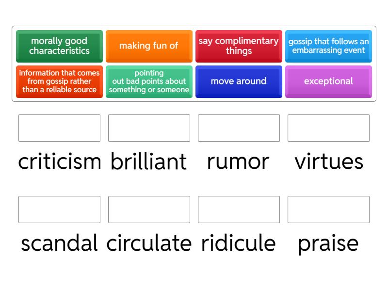 pointing out bad points about something or someone - criticism, making fun of - ridicule, say complimentary things - praise, move around - circulate, gossip that follows an embarrassing event - scandal, morally good characteristics - virtues, information that comes from gossip rather than a reliable source - rumor, exceptional - brilliant,