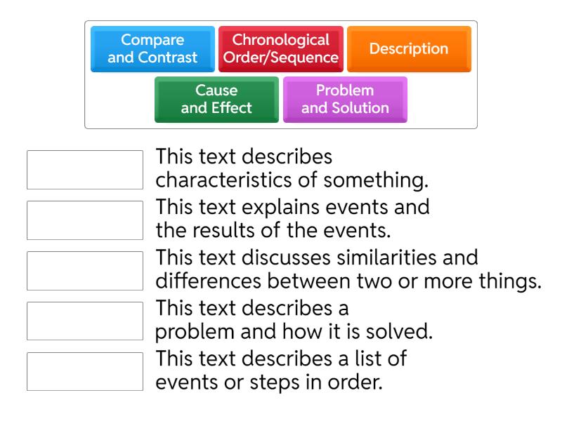 Problem and Solution - This text describes a problem and how it is solved., Chronological Order/Sequence - This text describes a list of events or steps in order., Description - This text describes characteristics of something., Compare and Contrast - This text discusses similarities and differences between two or more things., Cause and Effect - This text explains events and the results of the events.,