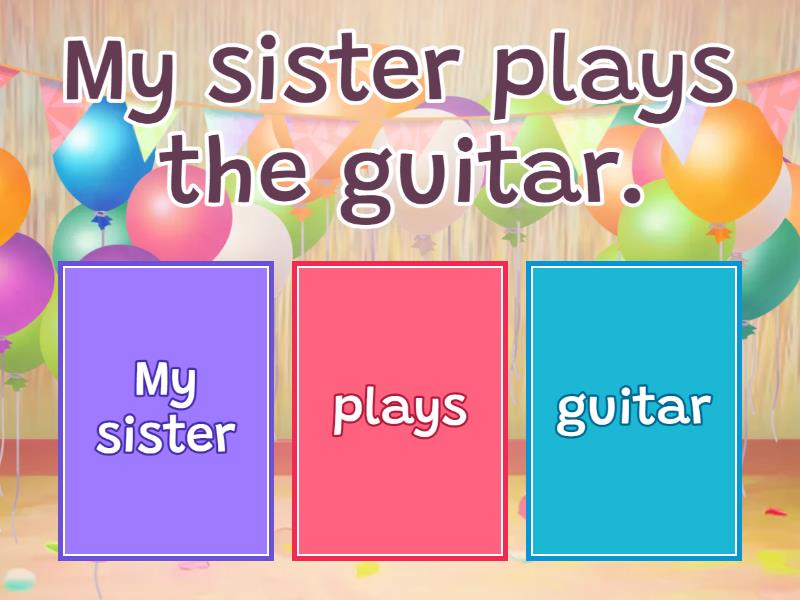 1) My sister plays the guitar. a) My sister b) plays c) guitar 2) My mom makes delicious chocolate cake. a) My mom b) chocolate cake c) makes d) delicious 3) The teacher reads a book. a) reads b) teacher c) a book 4) The students write their answers on the whiteboard. a) whiteboard  b) students c) write d) answers 5) Carlos rides his bike everyday. a) bike b) rides c) everyday d) Carlos 6) Maria smells the yellow flowers. a) yellow b) smells c) Maria d) flowers 7) Jasmin and Peter finished dinner. a) Jasmin and Peter b) dinner c) finished 8) The dog chased the cat. a) chased b) dog c) cat 9) My father makes breakfast every morning. a) father b) makes c) morning d) breakfast 10) Mr. Jones drove his car to work. a) drove b) Mr. Jones c) car d) work 11) Paul gave some money to Eva. a) Eva b) money c) Paul d) gave 12) The cat drank some water . a) cat b) water c) drank d) some 13) He bought flowers for Sylvia. a) bought b) flowers c) Sylvia d) He 14) She gave some cookies to her son.  a) She b) her son c) cookies d) gave 15) I sent a card to Nick. a) a card b) Nick c) sent d) I