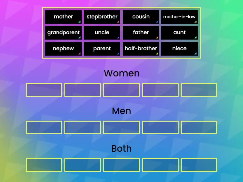 Women: aunt, mother, mother-in-law, niece, Men: father, half-brother, nephew, stepbrother, uncle, Both: cousin, grandparent, parent,